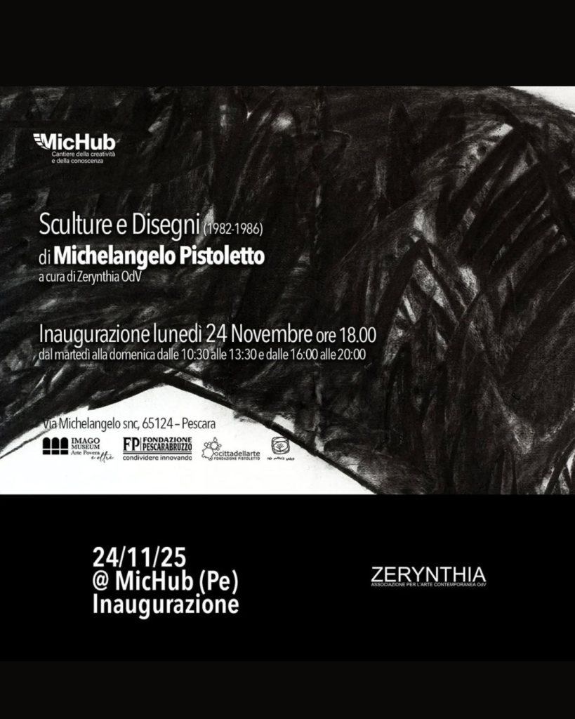 a cura di Zerynthia – Associazione per l’Arte Contemporanea OdV Lunedì 24 novembre 2025, ore 18:00 MicHub – Cantiere della creatività e della conoscenza Via Michelangelo snc, Pescara La Fondazione Pescarabruzzo inaugura al MicHub – Cantiere della creatività e della conoscenza un nuovo capitolo del progetto Arte Povera e oltre, dedicato alla ricerca di Michelangelo […]