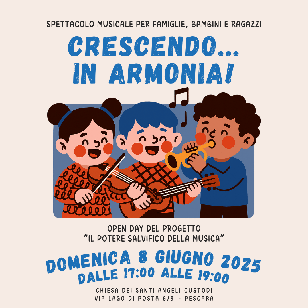 Il primo evento pubblico, “Open Day – Crescendo… in Armonia”, si terrà domenica 8 giugno dalle ore 17.00 presso la Chiesa dei Santi Angeli Custodi nel quartiere di Villa del Fuoco. Sarà una giornata