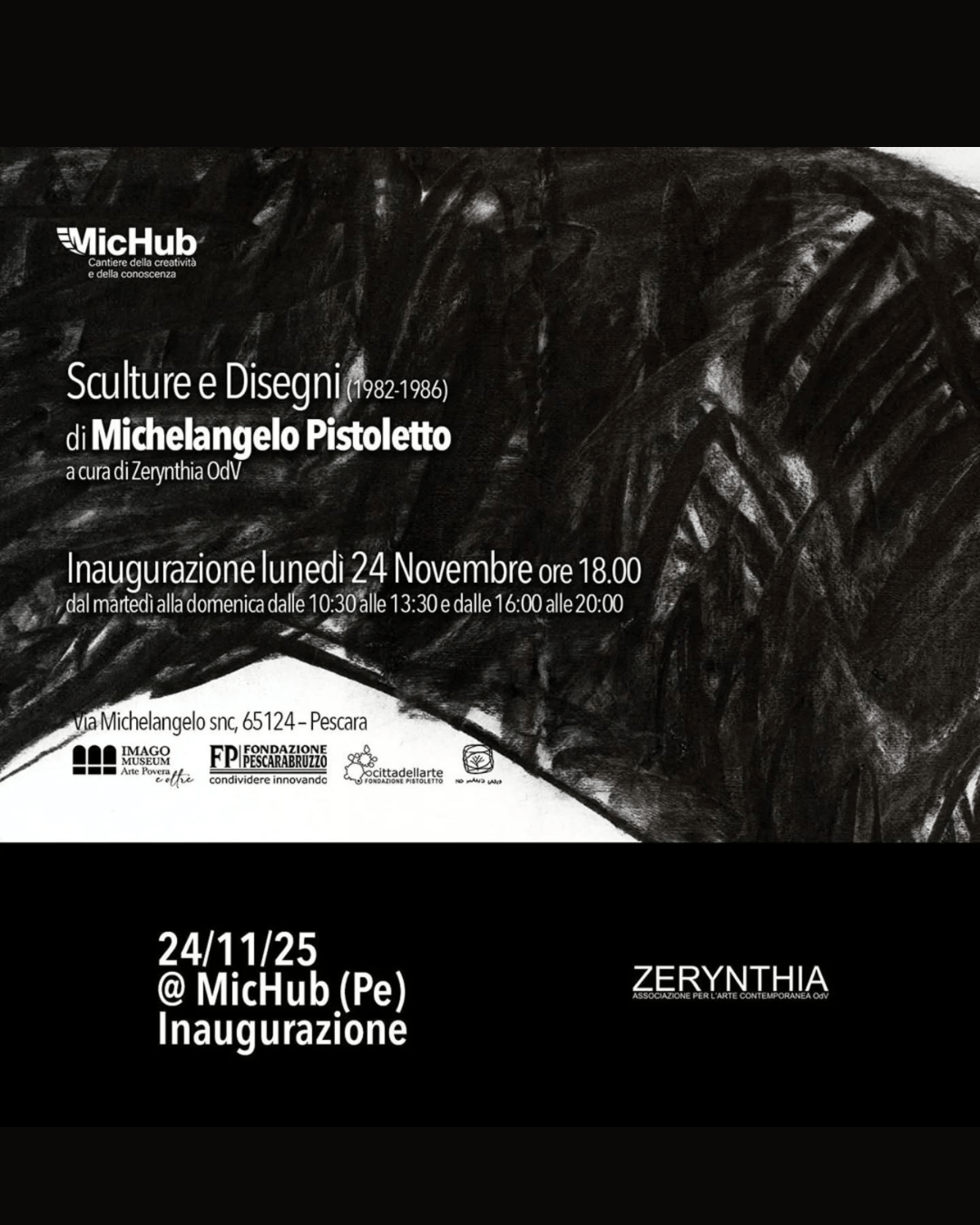 La Fondazione Pescarabruzzo inaugura al MicHub – Cantiere della creatività e della conoscenza un nuovo capitolo del progetto Arte Povera e oltre, dedicato alla ricerca di Michelangelo Pistoletto e, in particolare, al nucleo di opere realizzate tra il 1982 e il 1986. La mostra, Sculture e Disegni (1982–1986), è a cura di Zerynthia – Associazione per l’Arte Contemporanea OdV, legata alla Fondazione No Man’s Land, con la quale prosegue una collaborazione orientata alla valorizzazione dei linguaggi e dei protagonisti dell’arte contemporanea.