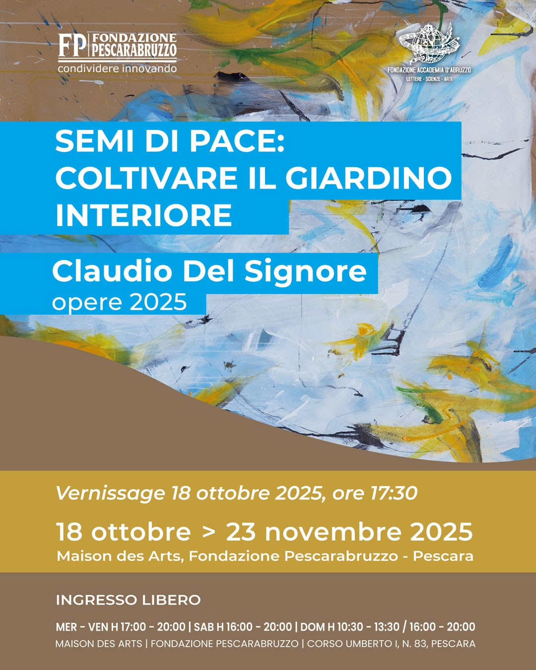 La Fondazione Pescarabruzzo presenta, negli spazi della Maison des Arts di Pescara, la mostra personale di Claudio Del Signore dal titolo “Semi di pace: coltivare il giardino interiore”, un percorso espositivo di opere inedite che intreccia introspezione, materia e gesto pittorico, invitando il pubblico a riscoprire un luogo di equilibrio e armonia dentro di sé.